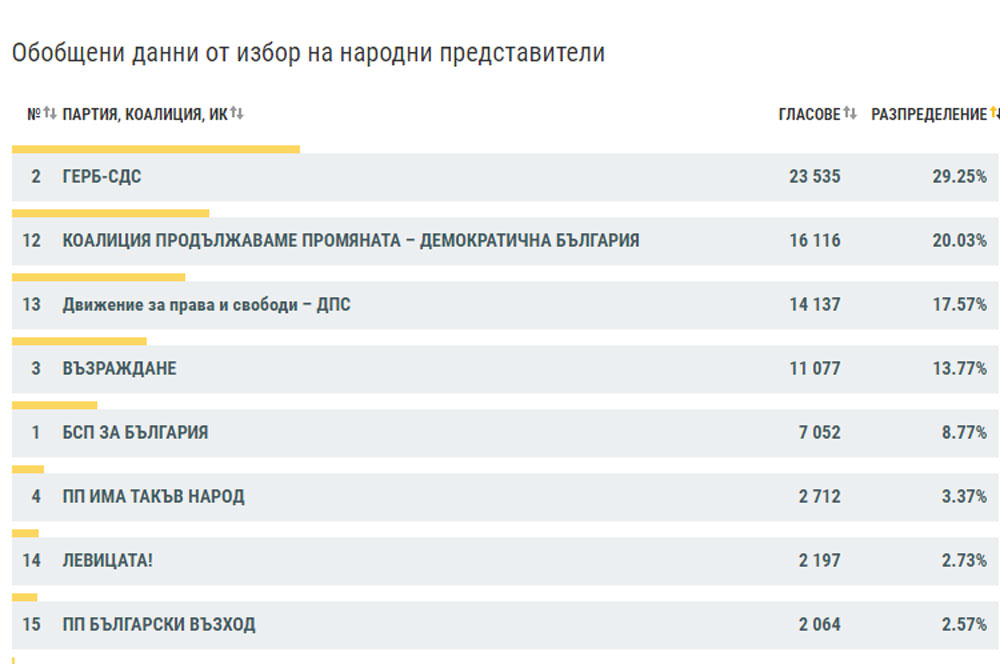 „Продължаваме Промяната – Демократична България“ печелят 20.03% (16 116 гласа), а ДПС са трети с 17.57% (14 137 гласа).