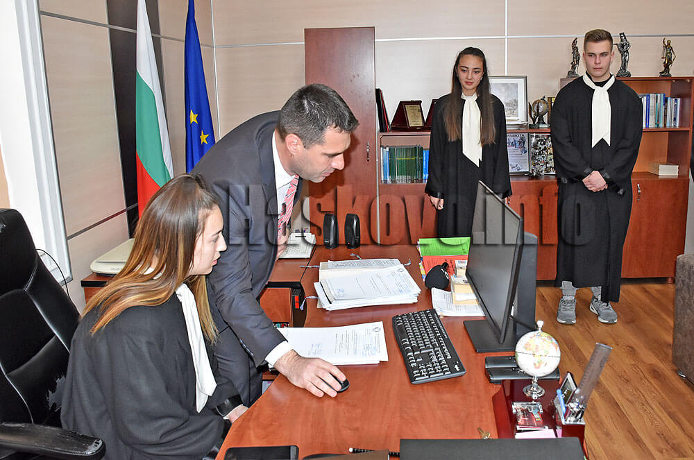 С работата на председателя Пламен Георгиев се запознаха гимназистите от паралелката „Съдебна администрация“. В тоги бяха Гергана Георгиева, Йоан Тонев и Виктория Хаджиева.