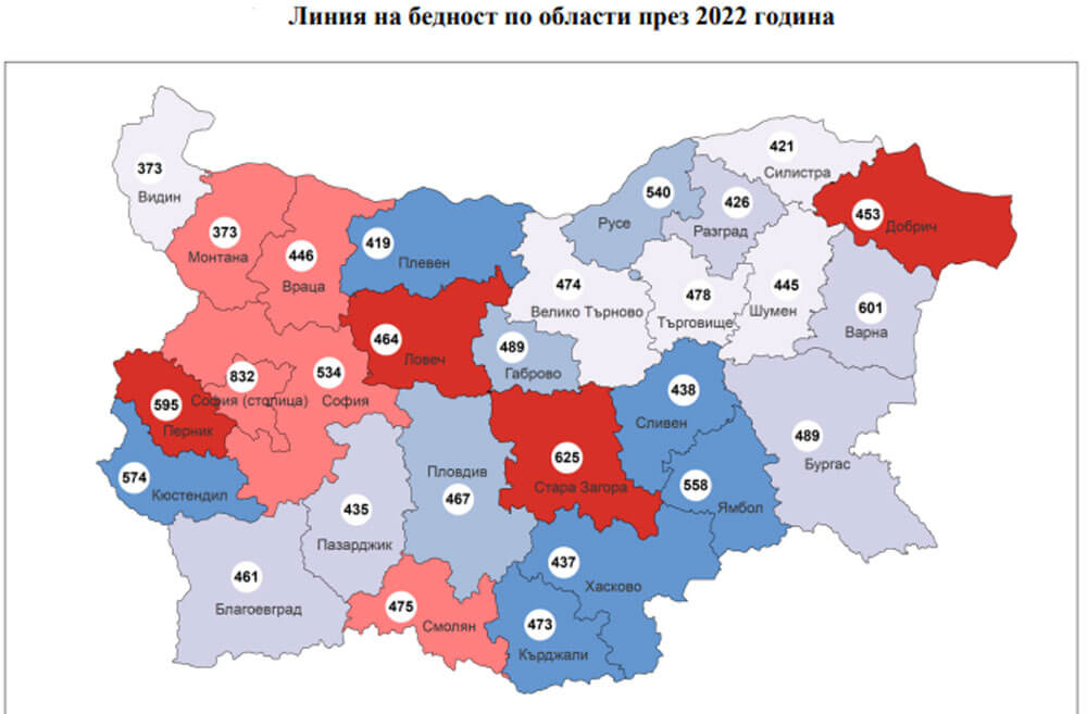 През 2022 г. най-ниската линия на бедност се наблюдава в областите Видин и Монтана – съответно по 373 лв., а най-високата – в област София (столица) (832 лв.), следвана от областите Стара Загора (625 лв.), Варна (601 лв.) и Перник (595 лева).