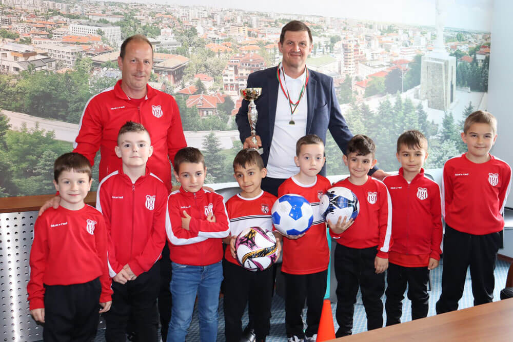 Малките футболисти от ФК „Хасково 1922“ с треньор Иван Николов подариха една от спечелените от тях купи на кмета Станислав Дечев, съобщават от общината.