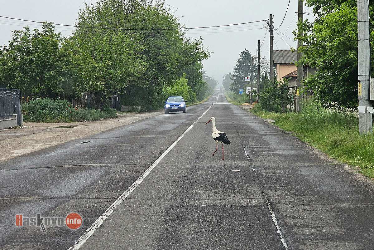 Щъркел в ролята на пешеходец срещат живеещите и преминаващите през хасковското село Подкрепа.