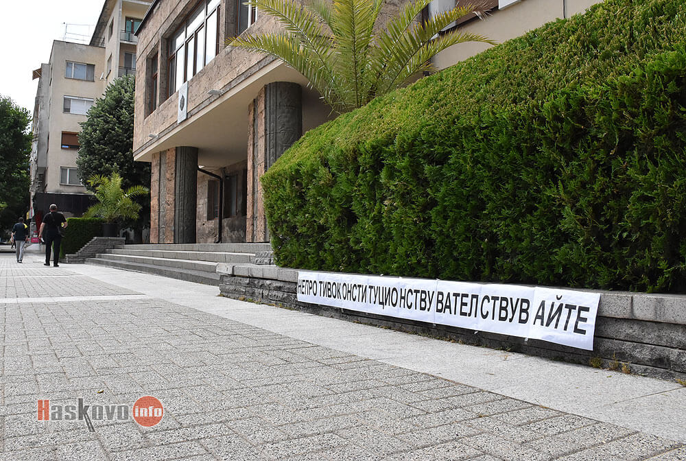 Надпис „Непротивоконституционствувателствувайте“ е залепен от мъж под формата на граждански протест пред Областна администрация – Хасково.