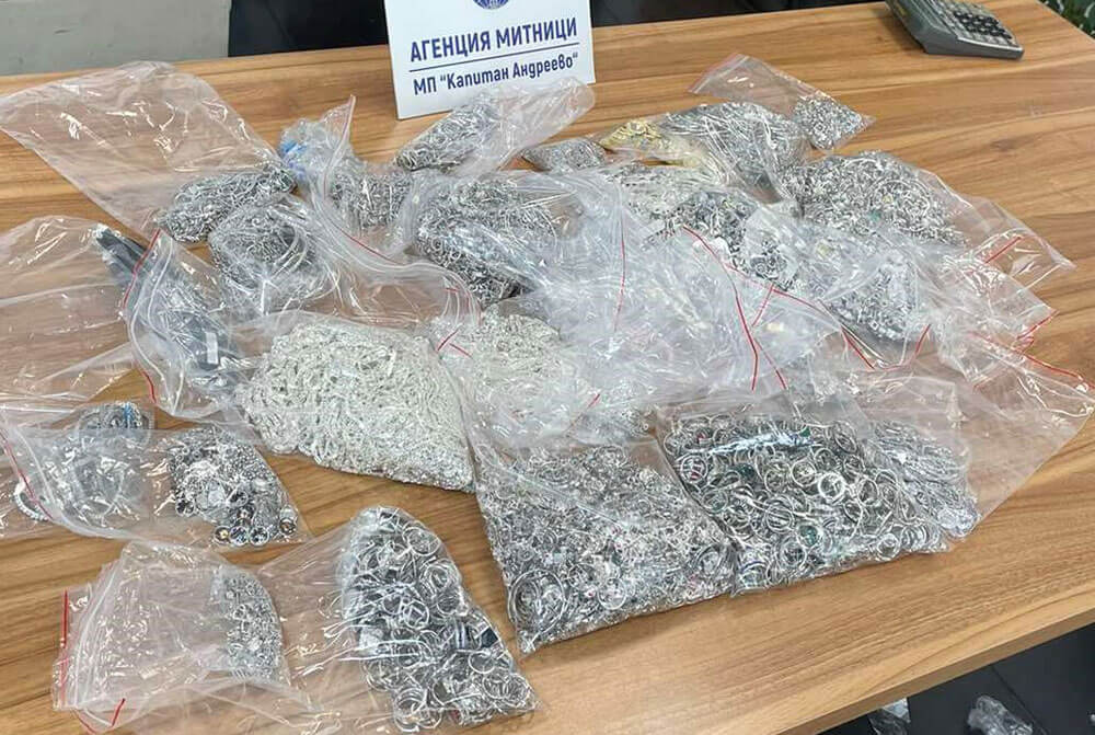 От укритията са извадени 84 пакета с изделия, които според експертизата на вещото лице са от сребро проба 925. Общото тегло на откритите бижута е 26.706 кг. на стойност 186 942 лева.
