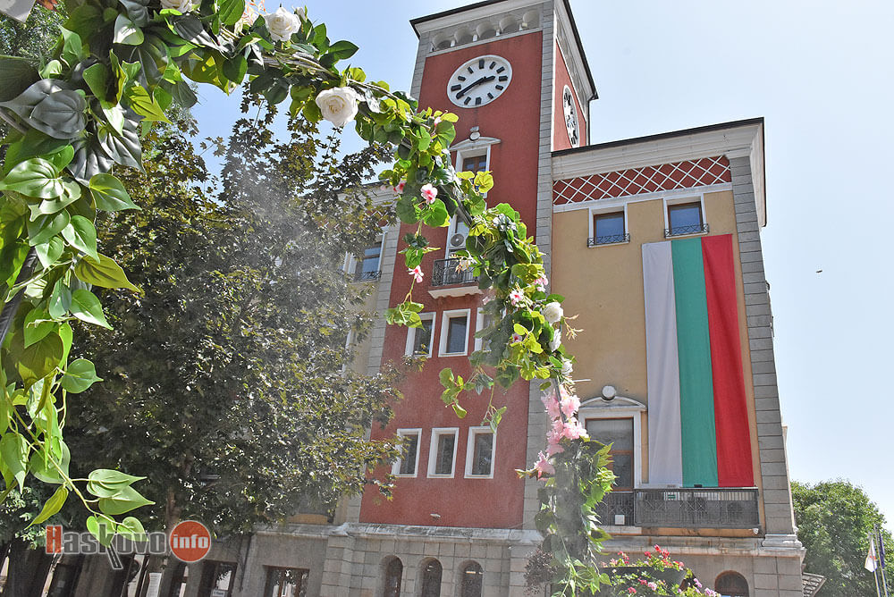Цветна арка с водна мъгла разхлажда в жегите минувачите покрай сградата на Община Хасково.