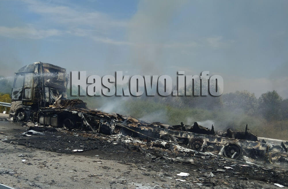 Произшествието е станало при километър 53 в района на село Поляново. Камионът е превозвал лесно запалим пластмасов товар.