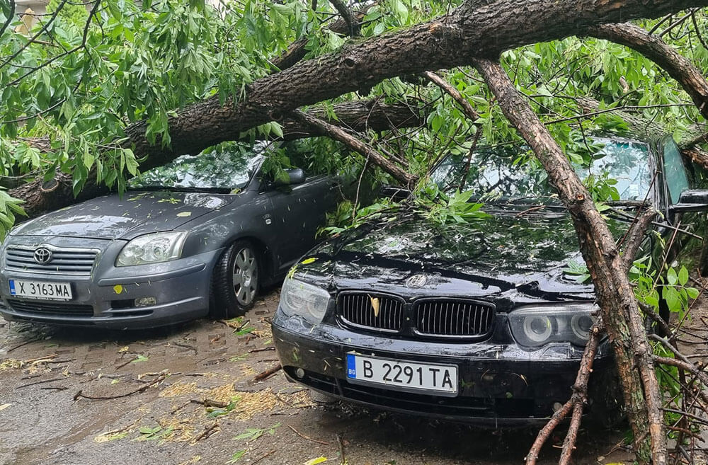В социалните мрежи се появиха снимки и коментари за паднали дървета върху коли и едра градушка. Все още се установяват щетите.
