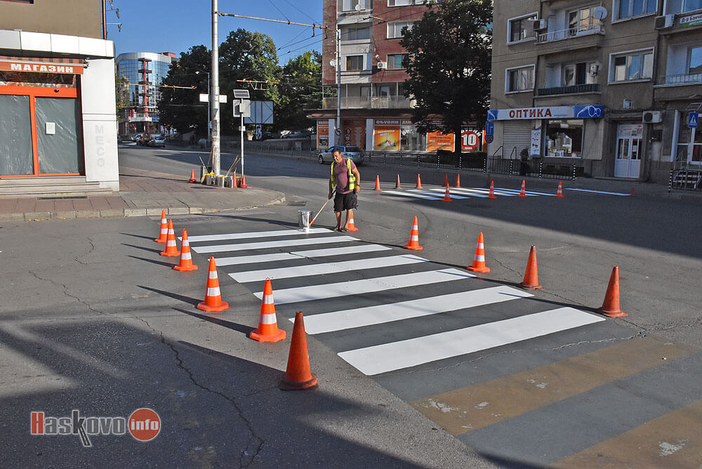 Работници на "Екопрогрес" освежават пешеходни пътеки на булевард "Съединение" в Хасково.