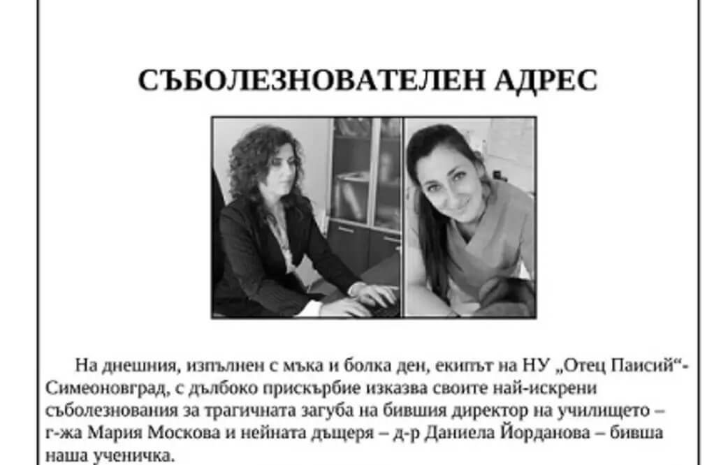 Мария Москова е била директор на училището, а Даниела е учила там. Отидоха си две изключително ерудирани, всеотдайни и уважавани личности, пишат в съболезнователния адрес екипът на школото.