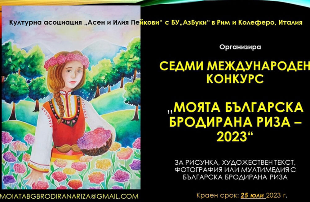 Целта на конкурса за рисунки, художествени текстове, фотография и мултимедия е да съхранява българския дух, изразяван чрез символите на българската шевица. Изложбата с творбите на победителите ще бъде открита в Арт-галерия „България“ в Рим на 30 септември и ще продължи до 6 октомври.