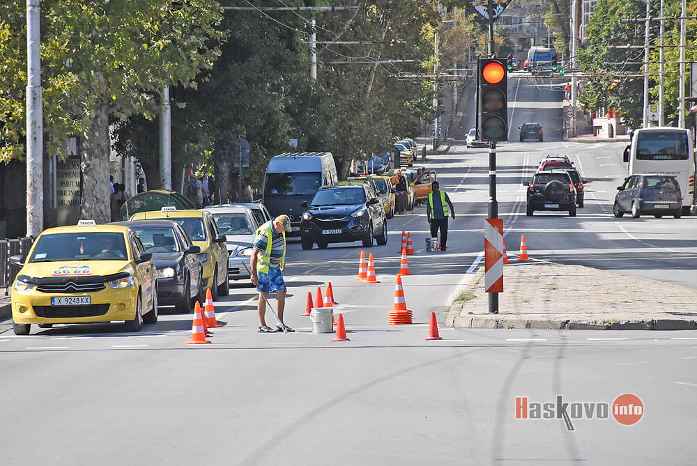 Работници на „Екопрогрес“ освежават маркировката по булевард „Съединение“ между автогарата и МБАЛ – Хасково.