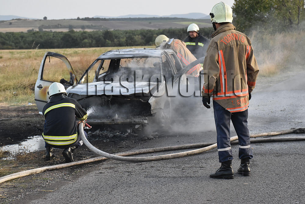Инцидентът стана около 18 часа на пътя за село Въгларово. Пламъците от колата се прехвърлиха на крайпътните сухи треви.