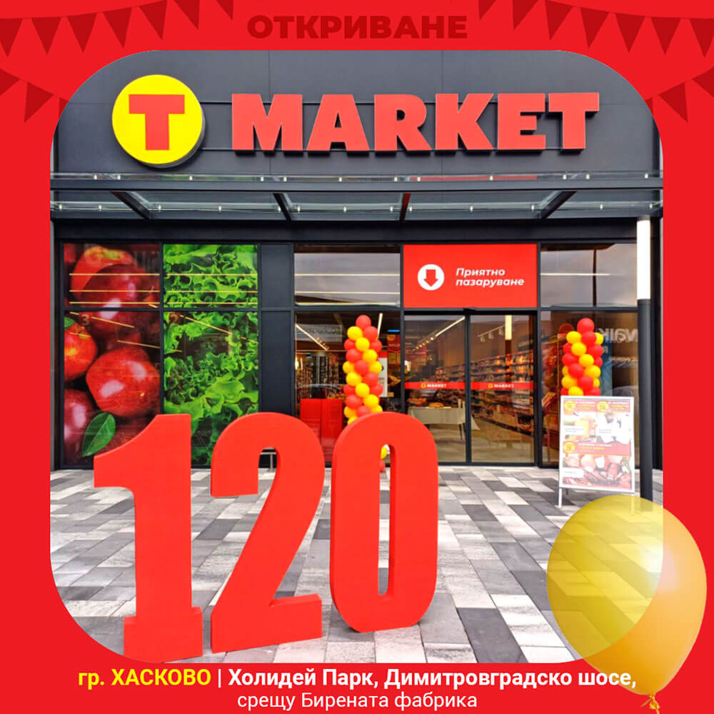 На 28.09.2023 г. Т MARKET откри своя 120-и магазин в гр. Хасково. Намира се в Търговски комплекс HOLIDAY PARK Хасково, на адрес Димитровградско шосе, срещу Бирената фабрика.
