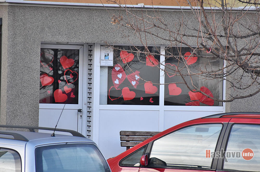 Вход на жилищен блок в Димитровград е украсен с валентинки в навечерието на Деня на влюбените – 14 февруари.