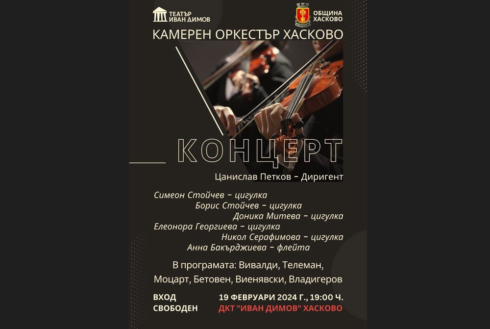 Камерен оркестър Хасково ще изнесе концерт на 19 февруари от 19 часа в театър „Иван Димов“, съобщават от общината.