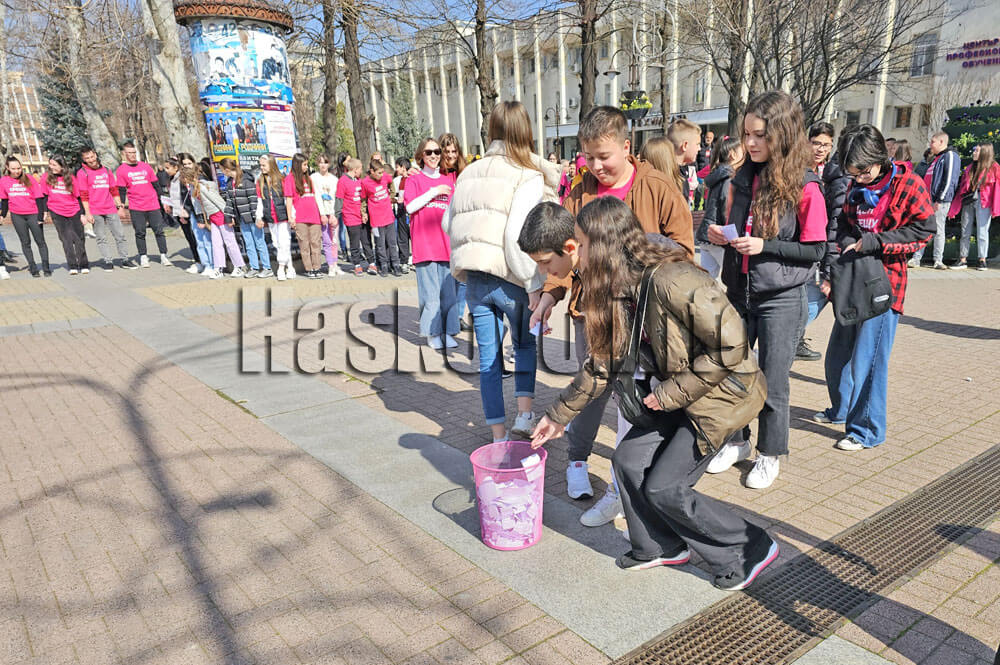 Розова рамка за снимки със силни думи-послания запечата спомена от днешния Ден срещу тормоза в Хасково.