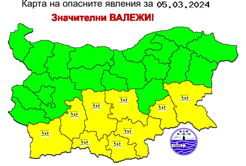 Очакваните количества за денонощието са до 30 литра на квадратен метър. Предупреждение е издадено още за областите Благоевград, Пазарджик, Пловдив, Смолян, Кърджали, Стара Загора, Ямбол и Бургас.