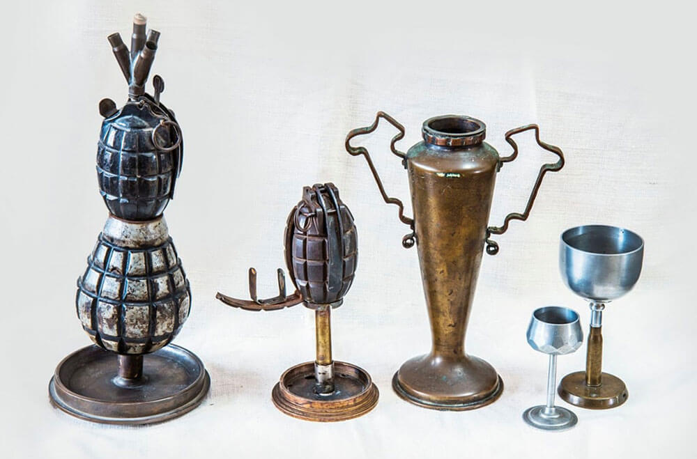 Шест от тях са дело на хасковския оръжеен майстор Янко Абаджиев, дядо на известния фотограф и оператор Янко Найденов, който дари ценните предмети на хасковския музей. Сред тях са декоративна масичка, изработена от немски снаряди и ръчни гранати, използвани през Първата световна война. А така също кибритница от граната, чаши за вино и ракия от снаряди и патрони, ваза от артилерийски боеприпаси, пепелник от мина.