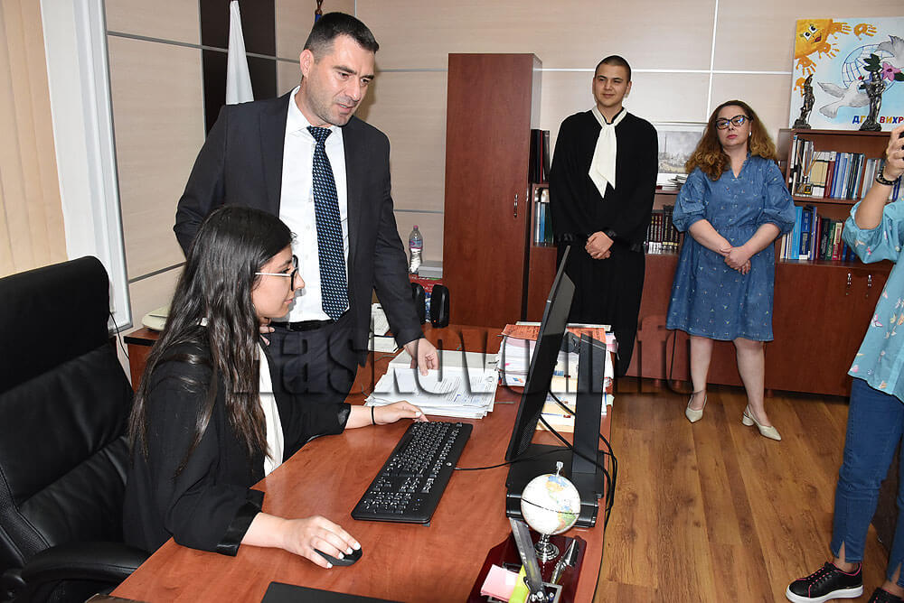 Председателят на съда Пламен Георгиев запозна учениците с работата на съда и системата за разпределение на делата в „Единна информационна система на съдилищата“ на принципа на случайния подбор. На председателското място седнаха Румяна Щерева и Димитър Иванов.