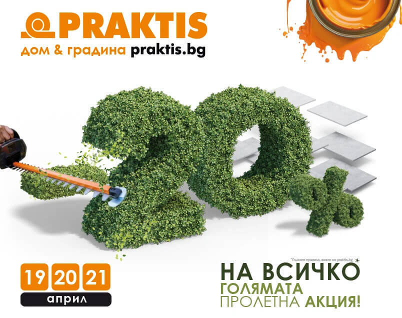 В периода от 19 до 21 април всички посетители на Хипермаркети PRAKTIS и онлайн магазина на praktis.bg могат да се насладят на отстъпка от -20% на всичко* за дома и градината.
