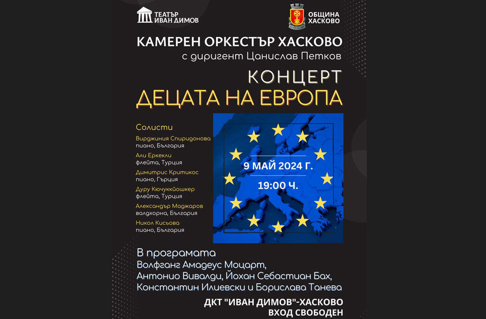 Камерен оркестър Хасково с диригент Цанислав Петков ще изнесе концерт „Децата на Европа“ на 9 май от 19 часа в театър „Иван Димов“.