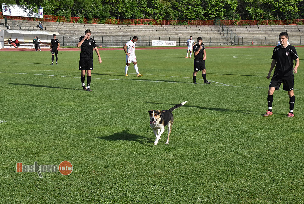 Футболната среща между „Саяна Хасково“ и „Сокол“ (Марково) на стадиона в парк „Ямача“ беше прекъсната за кратко от куче, което се разходи по терена. Домакините победиха с 6:0.