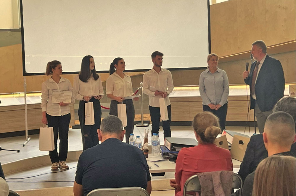 Зрелостниците Миглена Петрова, Денислава Янкова, Мартина Мичорова и Петър Георгиев от специалност „Строителство и архитектура“ с ръководител инж. Кръстю Крайнов спечелиха големия приз от Камарата на строителите в Епископската базилика на Филипопол в Пловдив, която беше домакин на финала .