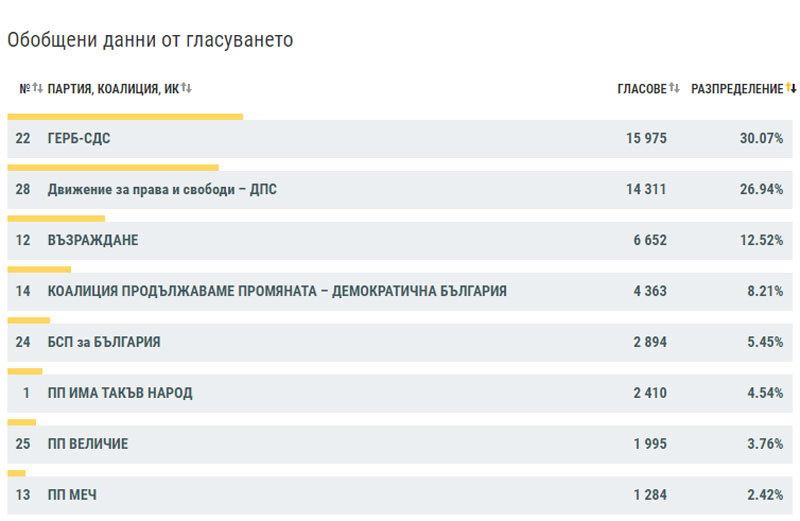 За тях са гласували 15 975 души – 30.07%. ДПС са втори с 14 311 гласа, или 26.94%. „Възраждане“ са трети с 6 652 гласа, 12.52%.