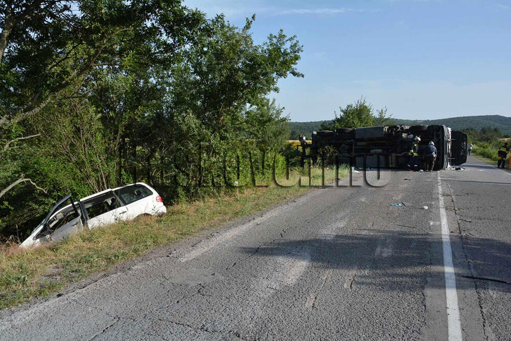 По данни на органите на реда обърналата се цистерна е ударила лек и товарен автомобил като лекият е излязъл от пътното платно в канавката.
