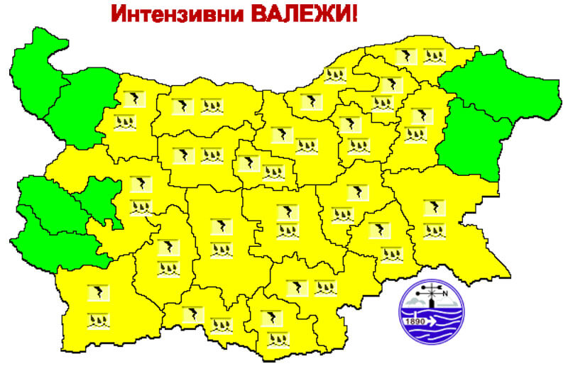Предупреждението включва още временни усилвания на вятъра, като ще има условия за градушки. На места валежите ще са между 25 и 40 литра на квадратен метър.