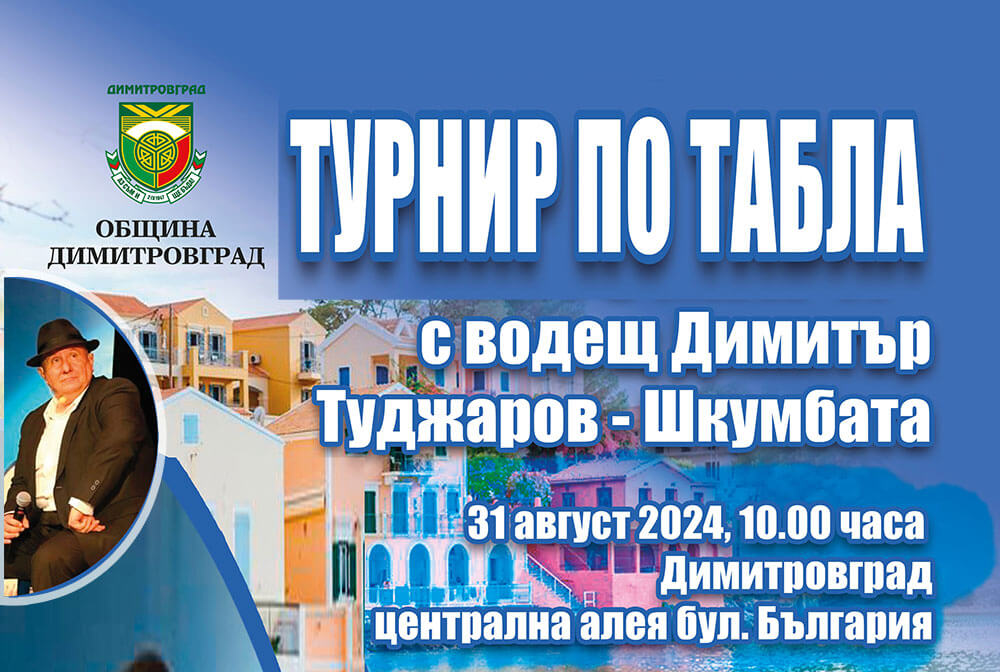 Турнир по табла с водещ шоуменът Димитър Туджаров – Шкумбата е част от празничната програма за Дните на Димитровград тази година.