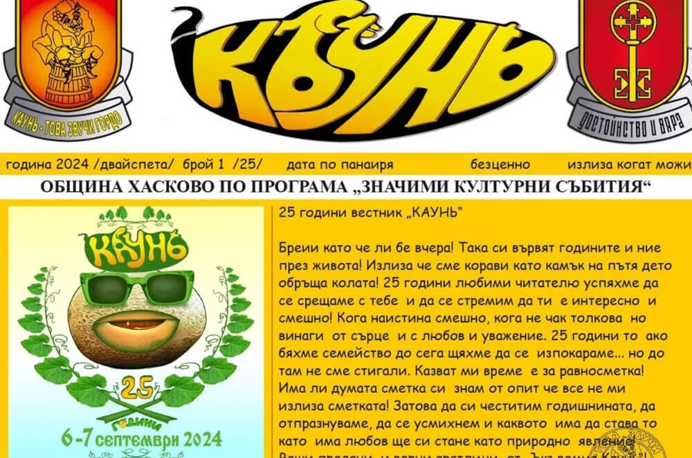 „25 години, любими читателю, успяхме да се срещаме с тебе да се стремим да ти е интересно и смешно… Да отпразнуваме годишнината, да се усмихнем и каквото има да става…“ Така верните и предани аратлици от Акъдемия „Каунь“ пишат в юбилейния брой на електронния вестник „Каунь“, който е вече в нета.
