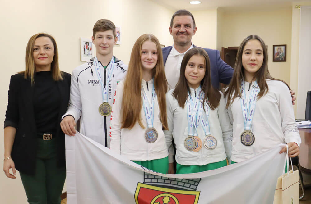 Кметът Станислав Дечев подари знамето на Хасково на медалистите от Световното първенство по аеробика от клуб „Мега спорт“.