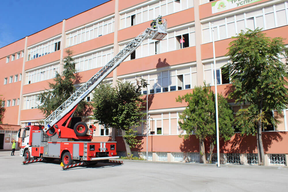 С последното поколение противопожарна стълба беше „спасена“ Христина Ташева, която е психолог в училището.