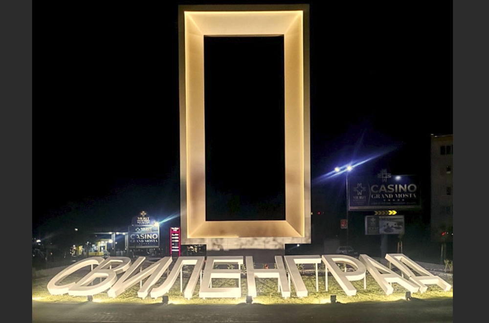 Отпред с големи букви на кирилица е изписано името на града. Зелената площ е оформена с тревни масиви, декоративни каменни ивици, дървета, храсти и цветя. Цялата композиция е осветена с насочена светлина.