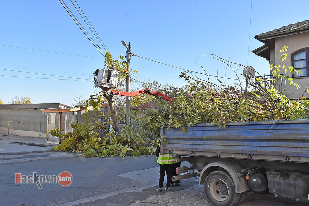 От „Екопрогрес“ окастриха клоните на дърво, оплетени в жици на булевард „Стефан Стамболов“ в Хасково.