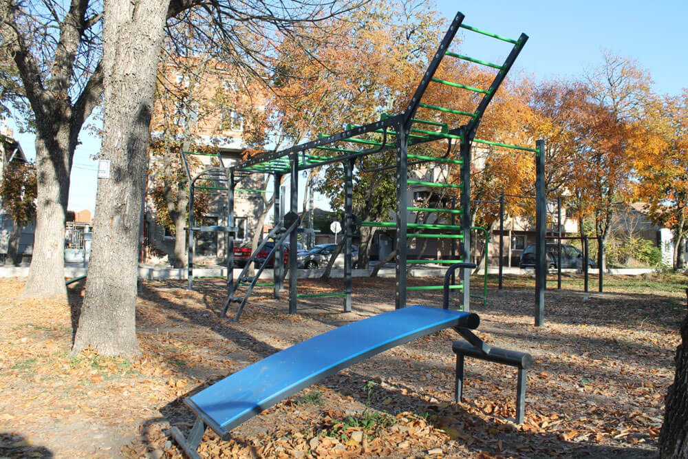 Изработен е от сертифицирани стоманени профили. Бетонната площадка за монтиране на съоръжението подготви Общинско предприятие „Благоустрояване и озеленяване”. Жителите на квартала могат свободно и по всяко време да ползват уреда за спорт и тренировки.