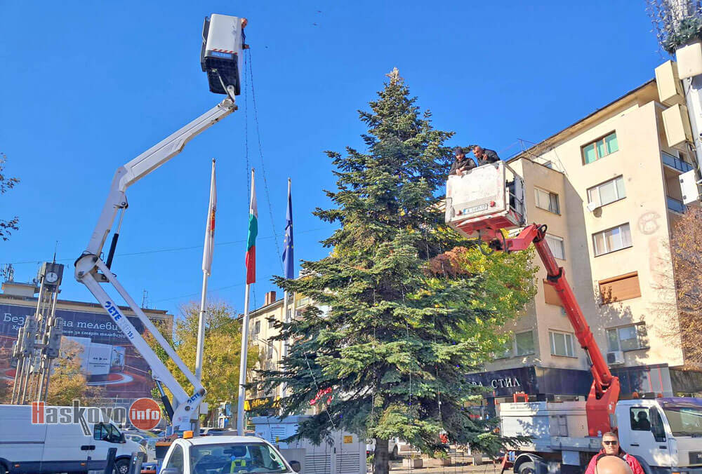 С помощта на две вишки беше украсена елхата в центъра на Хасково в навечерието на Коледно-новогодишните празници.