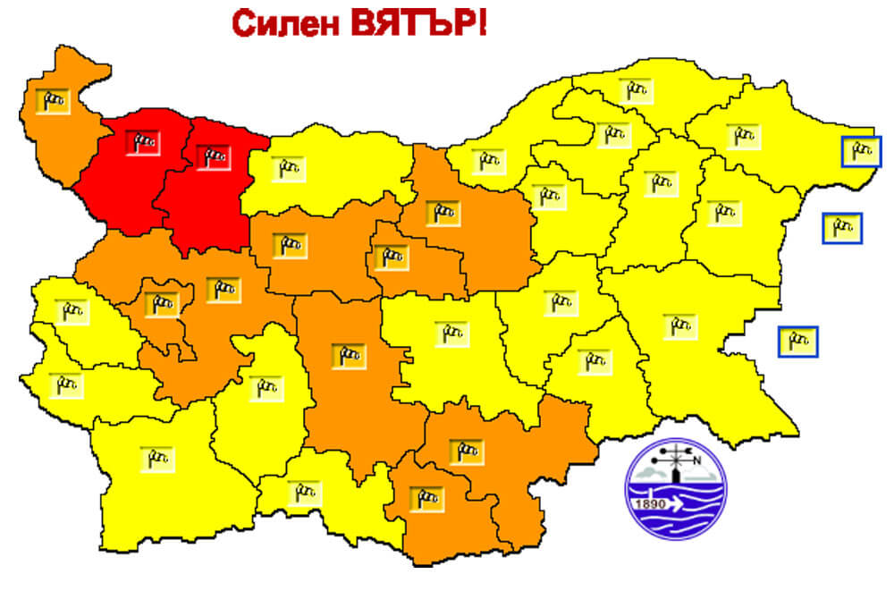 В останалите общини е в сила жълт код, като пулсациите на вятъра ще са до 90 км/ч.