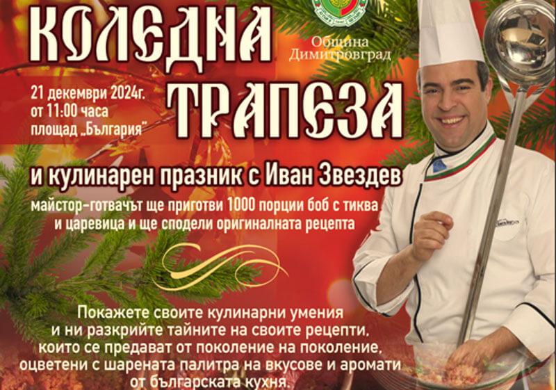 Коледна трапеза, дегустация на вина, вкусен боб с тиква и царевица, приготвен от популярния майстор-готвач Иван Звездев очакват димитровградчани на 21 декември от 11 часа на площад „България“, съобщават от общината.