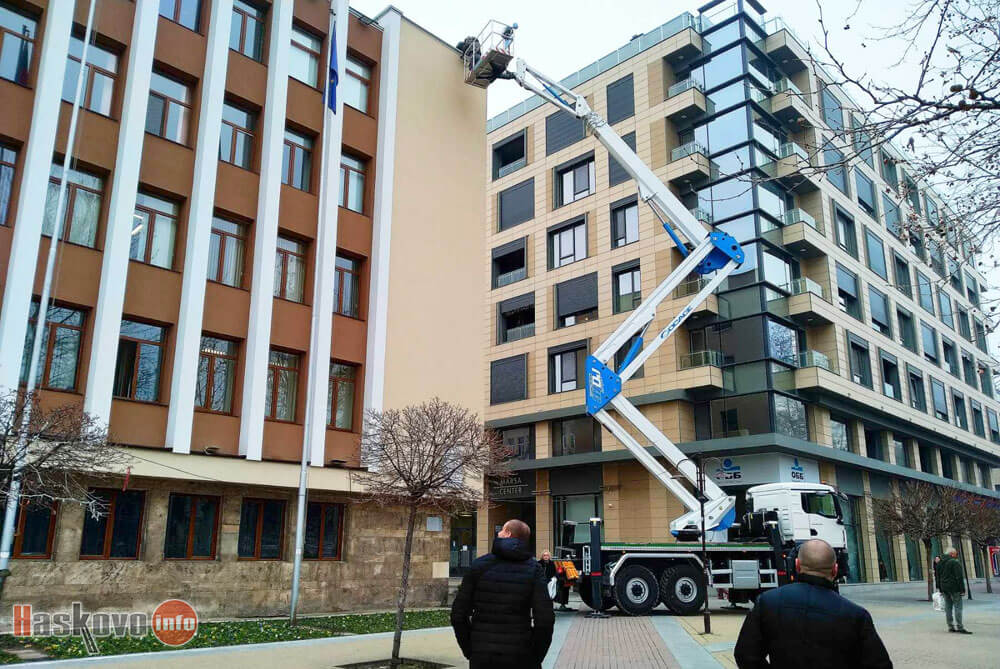 С голяма вишка се подменя осветлението по сградата на областната администрация в Хасково.