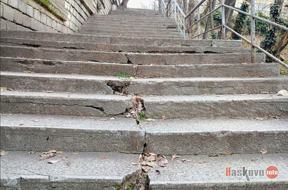 За пукнатини на стълбището, свързващо булевард „България“ и улица „Стара планина“ до училище „Васил Левски“ в Хасково, сигнализираха читатели на Haskovo.info.