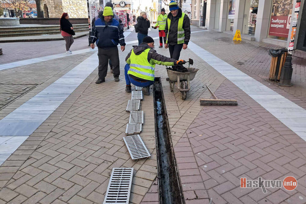 Работници почистват шахтите в пешеходната зона на Хасково, като предстои отпушването и на тези по булевардите.