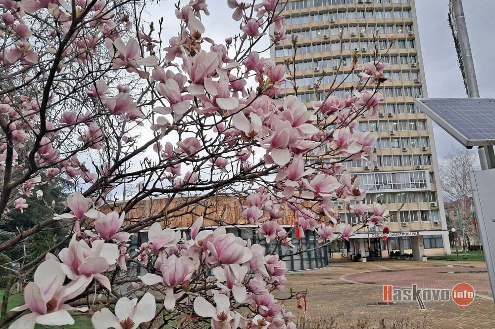 Красива магнолия цъфти на централния площад "България" в Димитровград.