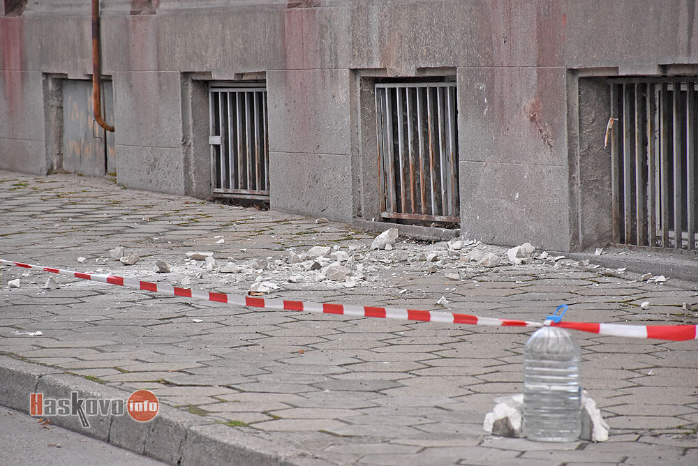 Тротоарът от източната страна на централната поща в Хасково е отцепен заради падаща мазилка и елементи от фасадата.