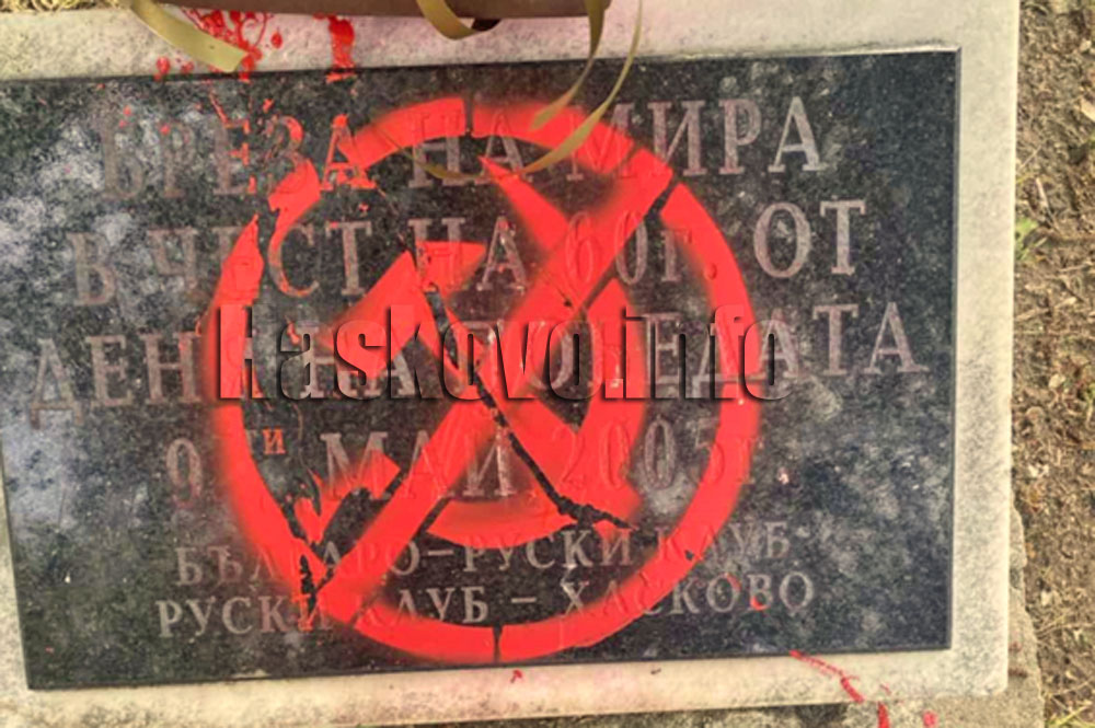 Паметната плоча Бреза на мира в центъра на Хасково осъмна на 9 май с червена боя.