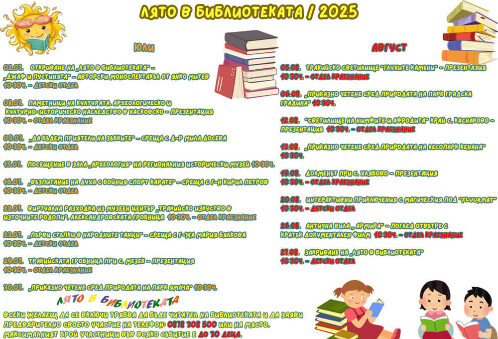 Традиционната инициатива „Лято в библиотеката“ ще бъде открита на 2 юли в детския отдел на Регионална библиотека „Христо Смирненски“ в Хасково.