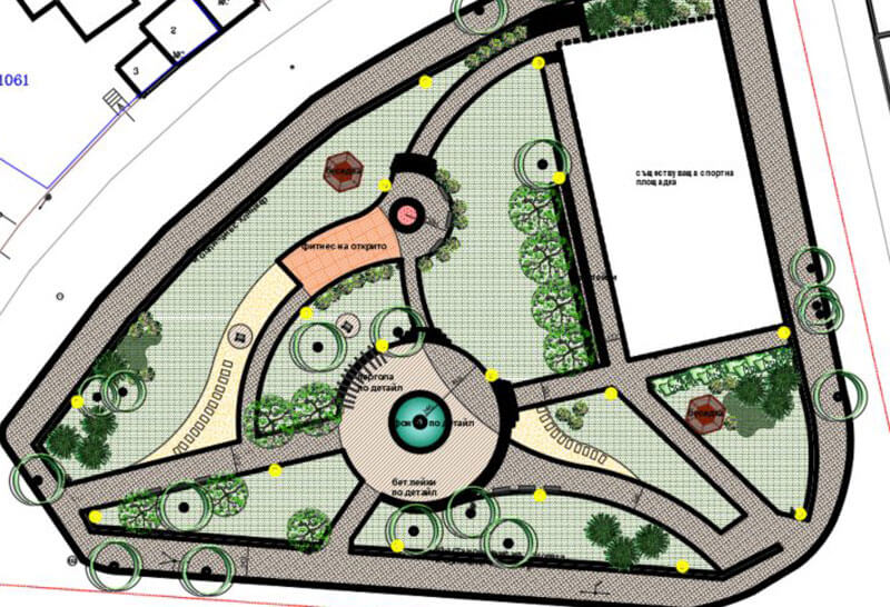 В парковата зона централно място заема нов фонтан, около който се изгражда зона за отдих и социални контакти. Пространството включва пейки, беседки, перголи, декоративна растителност и архитектурни елементи, създаващи уют и възможности за спокойствие и срещи.