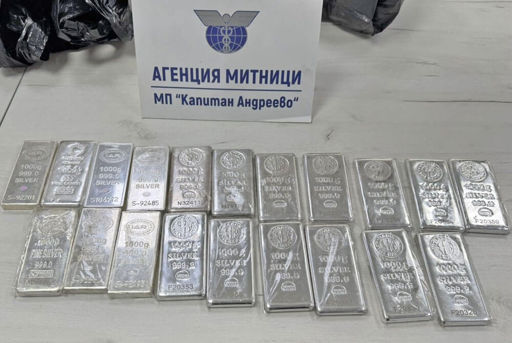 20 кг. контрабандни сребърни кюлчета са открити при проверка на лек автомобил с българска регистрация на ГКПП „Капитан Андреево“, съобщават от Агенция „Митници“.
