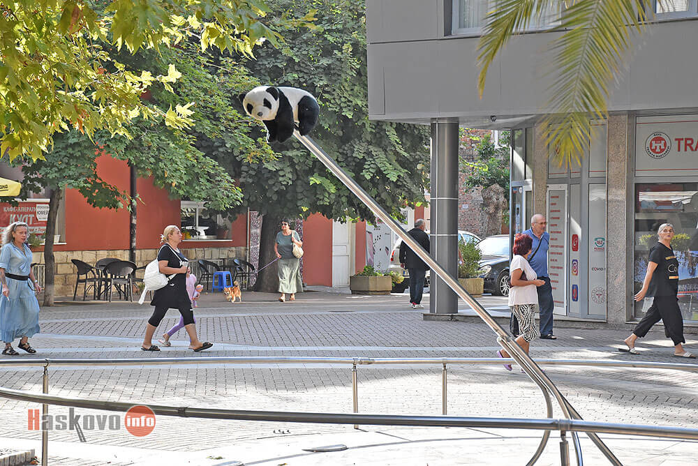 Плюшена панда се е "покатерила" на слънчевия часовник в центъра на Хасково.