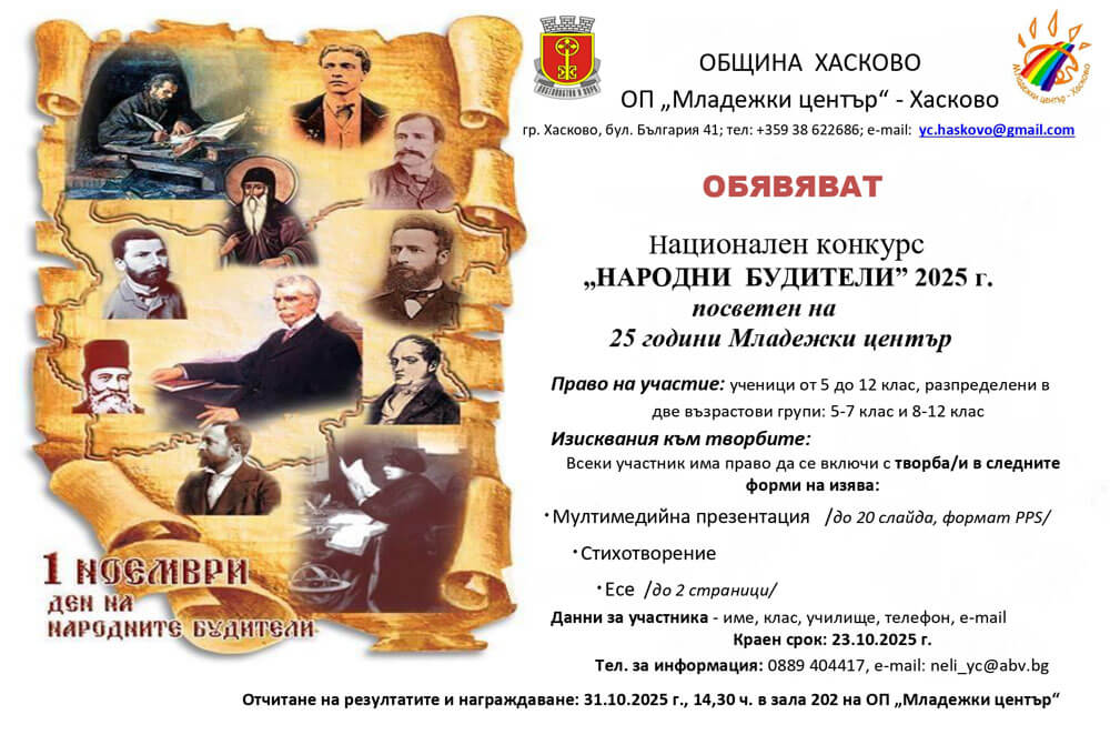 Национален конкурс „Народни будители“ обявиха от хасковския Младежки център, съобщават от общината.